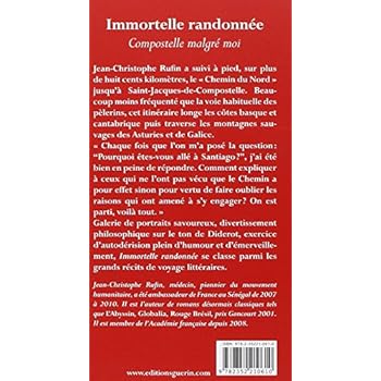 Jean-Christophe Rufin a suivi à pied, sur plus de huit cents kilomètres, le «Chemin du Nord» jusqu'à Saint-Jacques-de-Compostelle. Beaucoup moins fréquenté que la voie habituelle des pèlerins, cet itinéraire longe les côtes basque et cantabrique puis traverse les montagnes sauvages des Asturies et de Galice. «Chaque fois que Ton m'a posé la question : "Pourquoi êtes-vous allé à Santiago ?", j'ai été bien en peine de répondre. Comment expliquer à ceux qui ne l'ont pas vécu que le Chemin a pour effet sinon pour vertu de faire oublier les raisons qui ont amené à s'y engager ? On est parti, voilà tout.» Galerie de portraits savoureux, divertissement philosophique sur le ton de Diderot, exercice d'autodérision plein d'humour et d'émerveillement, Immortelle randonnée se classe parmi les grands récits de voyage littéraires. Jean-Christophe Rufin, médecin, pionnier du mouvement humanitaire, a été ambassadeur de France au Sénégal de 2007 à 2010. Il est l'auteur de romans désormais classiques tels que L'Abyssin, Globalia, Rouge Brésil, prix Concourt 2001. Il est membre de l'Académie française depuis 2008.